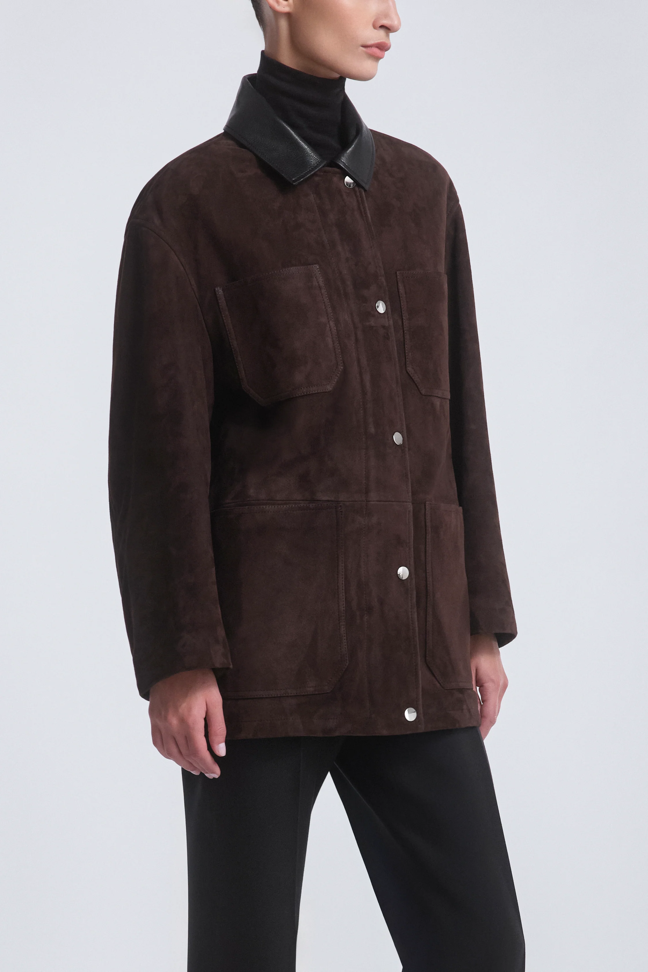 A soft-structured utility coat in vibrant lambskin suede, blending effortless cool with city dressing. Relaxed silhouette accented with a black leather collar and snap button closures.