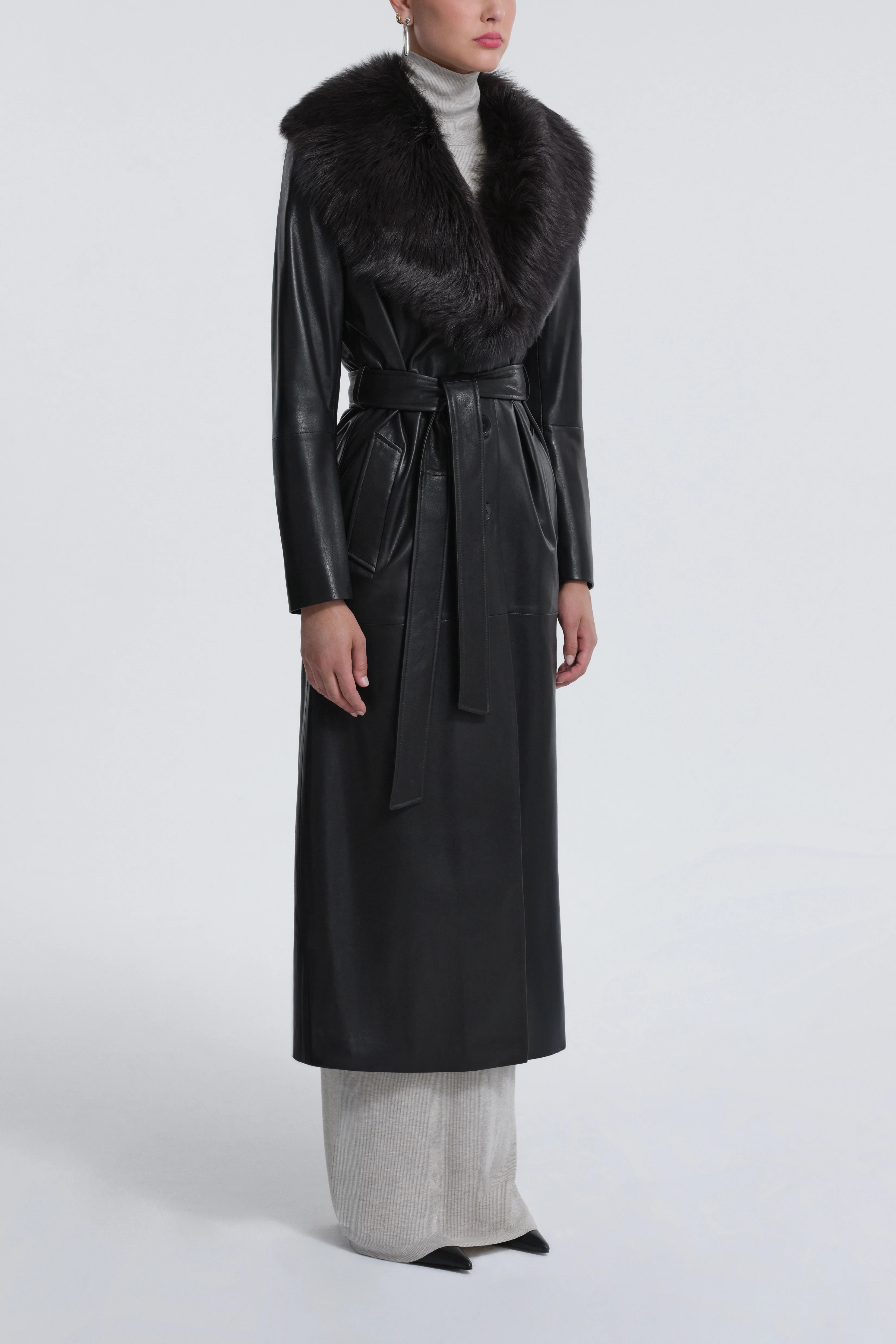 A sculptural coat in rich, polished leather with heirloom appeal. Accented by a decadent shearling collar and belted to define the silhouette. Signature piece that layers with ease and lasting elegance.