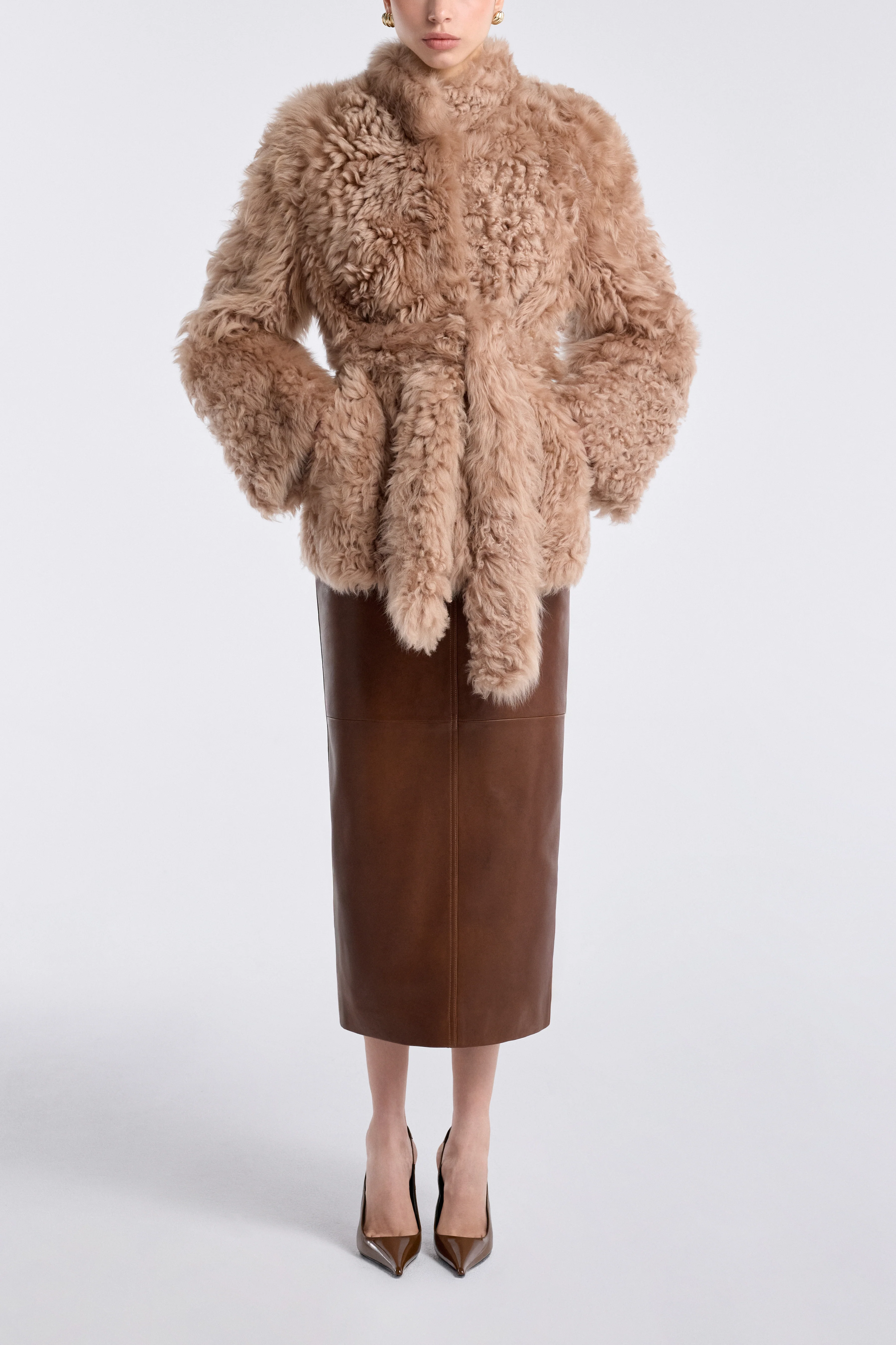 A mid length coat in decadent, lustrous shearling. Defined by a high collar, hidden snaps, and a self tie belt to cinch the waist. An heirloom piece with commanding presence and sculptural allure.