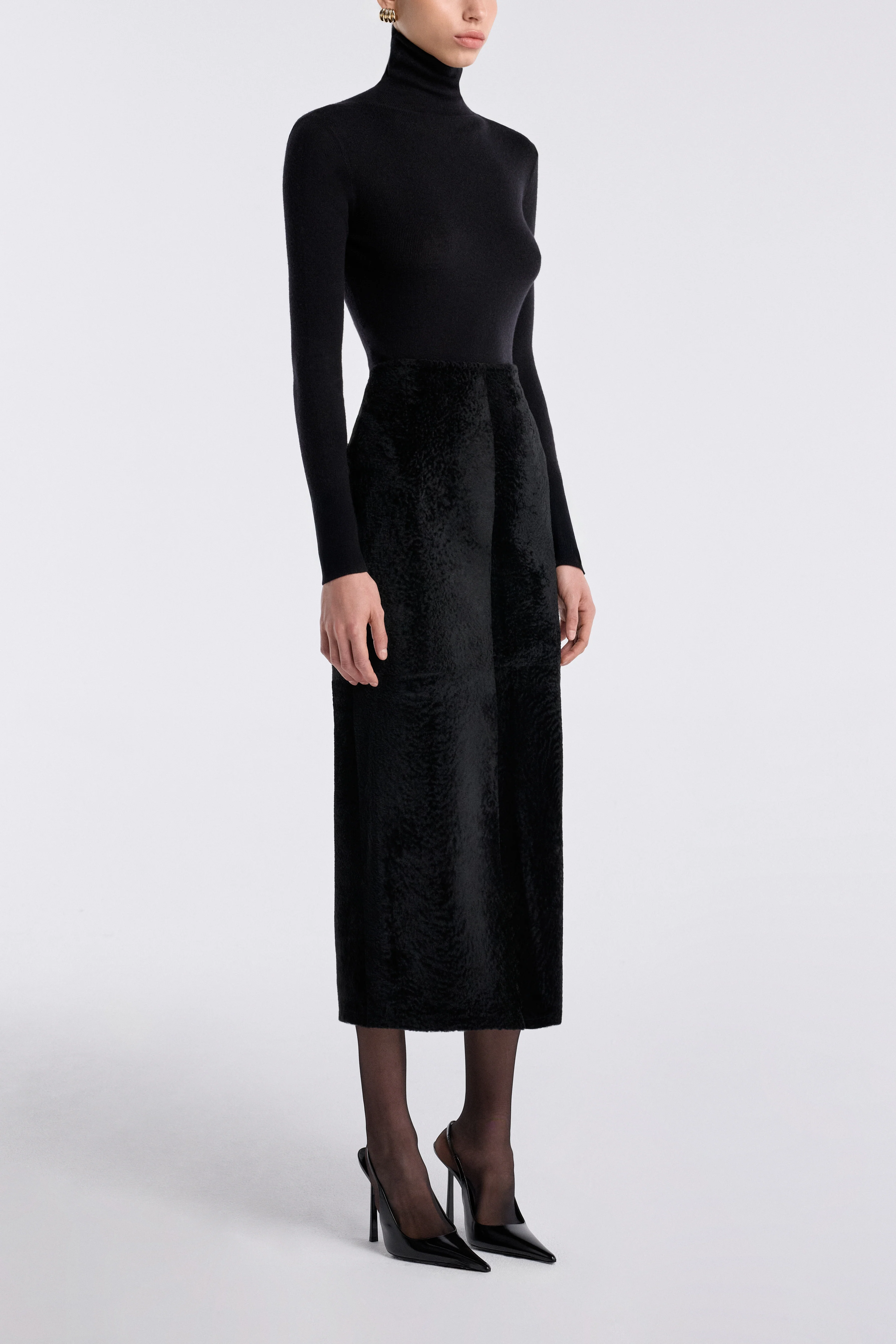 The velvety shearling skirt stands as the new uniform of sophistication. Streamlined, ankle-length, and unapologetically sleek, it defines modern allure with a bold, polished finish.