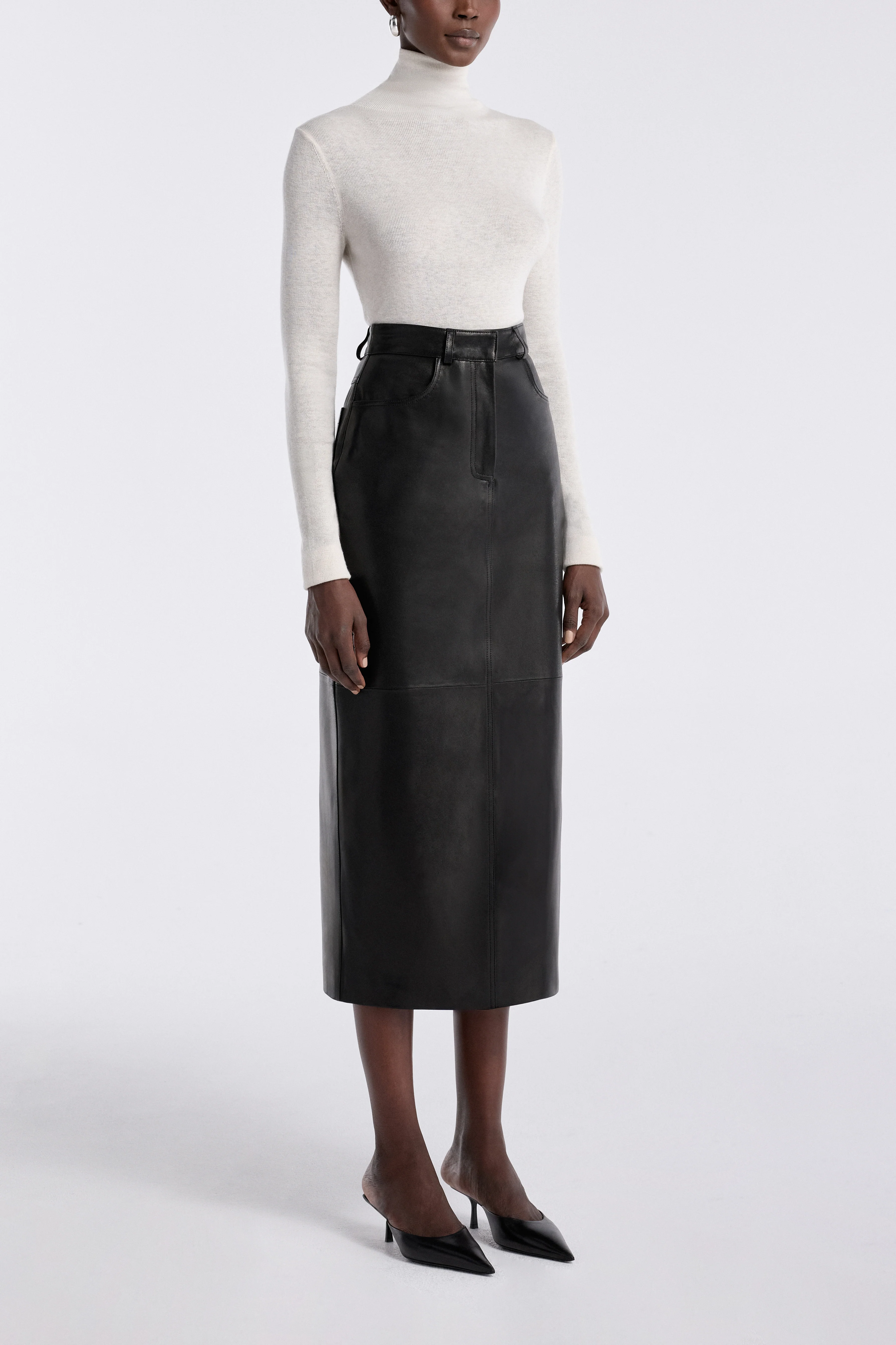 An elongated skirt crafted from soft, supple leather. Minimal in form yet rich in texture, it captures a sense of refined sensuality, timeless, versatile, and undeniably polished.