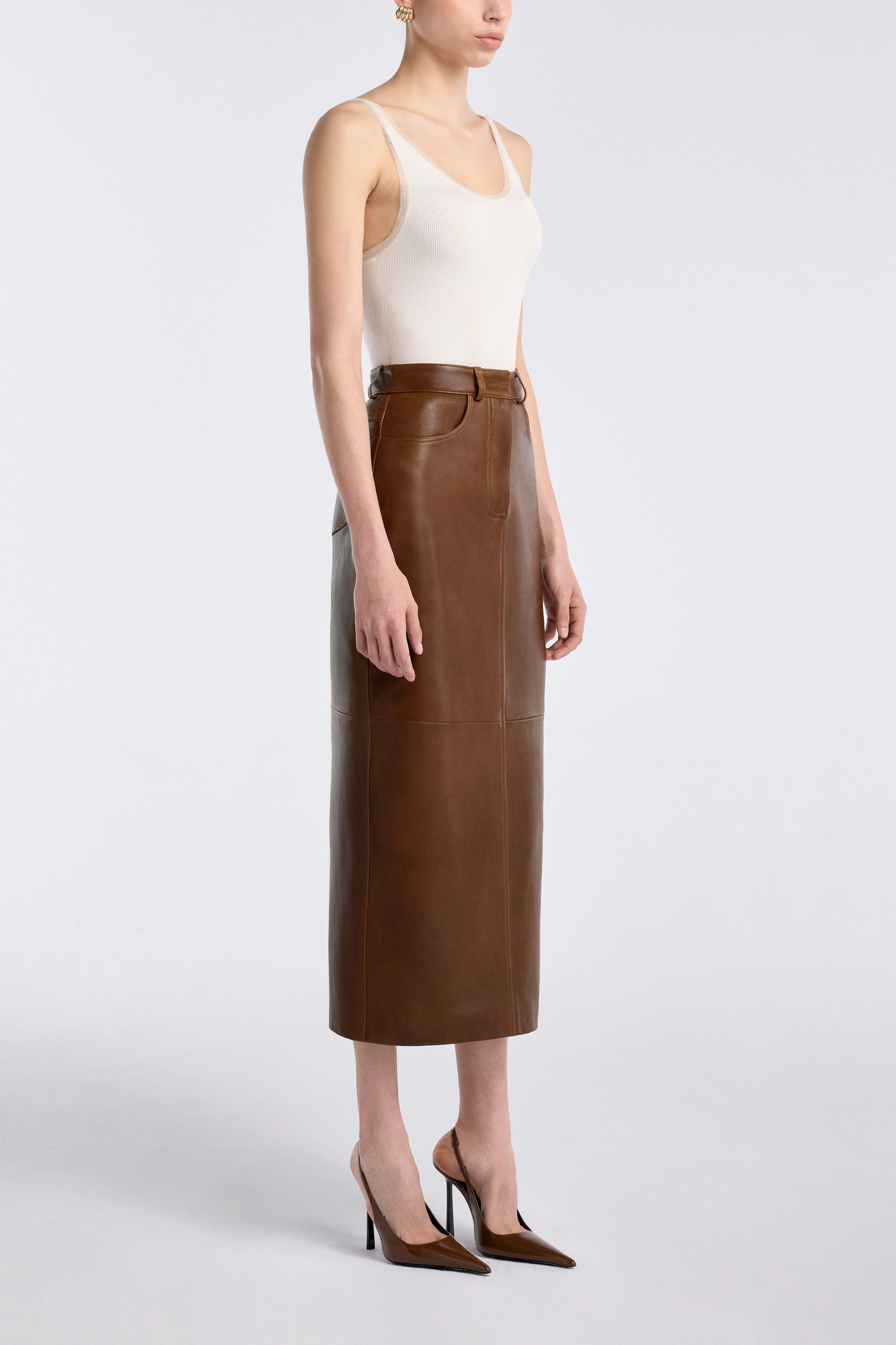 An elongated skirt crafted from soft, supple leather. Minimal in form yet rich in texture, it captures a sense of refined sensuality, timeless, versatile, and undeniably polished.