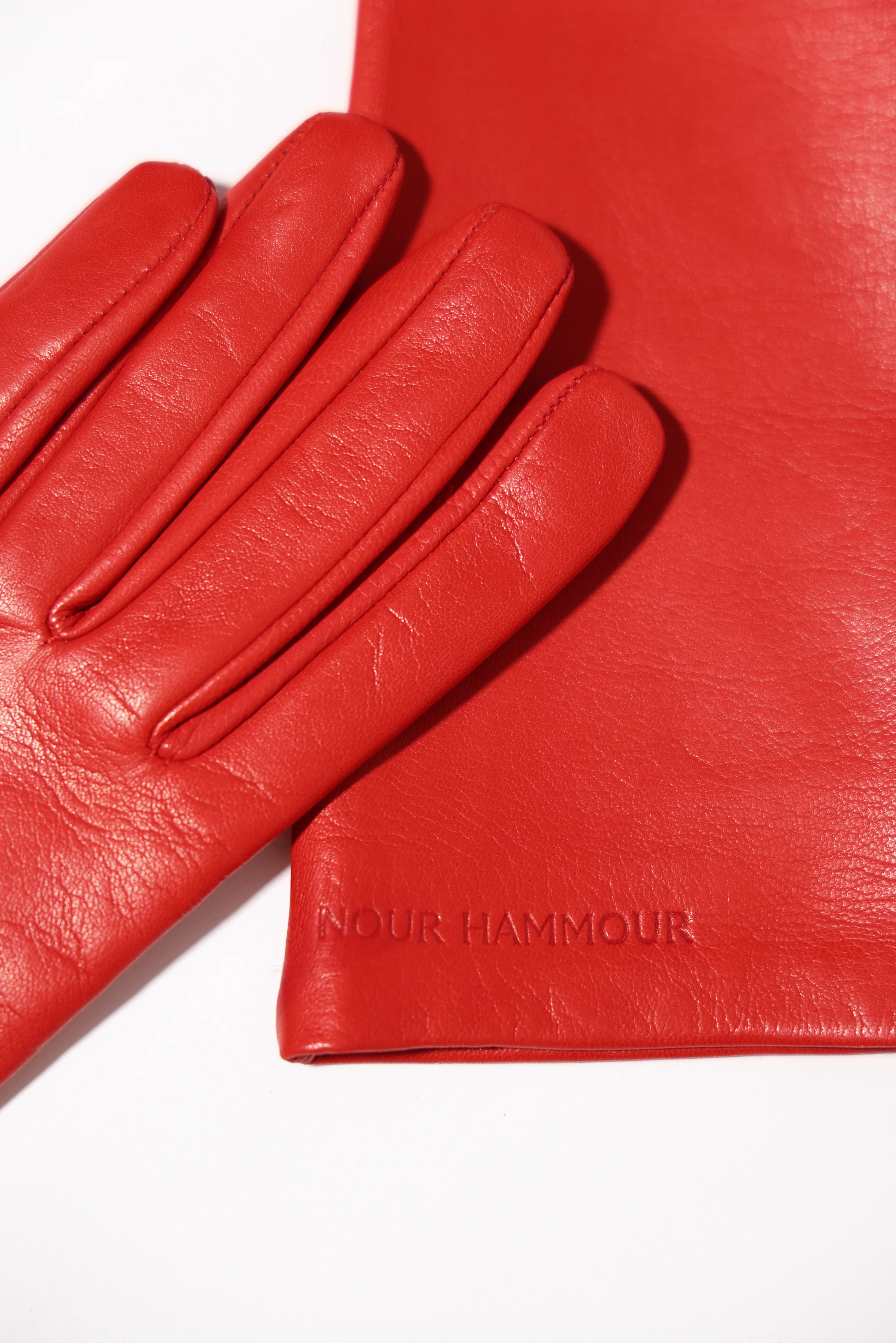Elongated gloves in smooth leather. Slim fit through the fingers, finished with tonal seaming.
