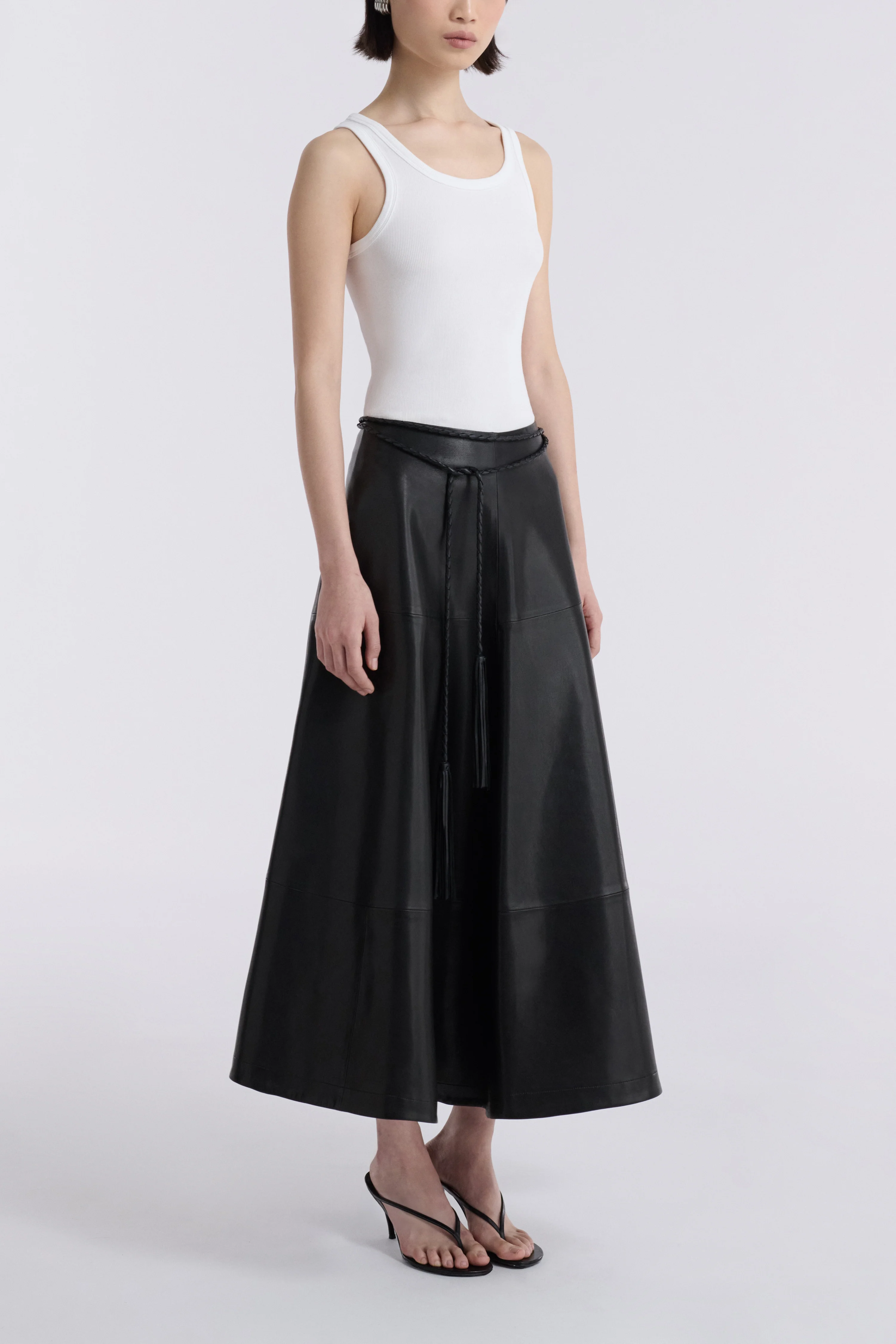 A suppler leather skirt cut with sculptural grace and dramatic flare. Sits high on the waist with paneled seams that curve, release, and move. Closes with a hidden side zip for a clean line.