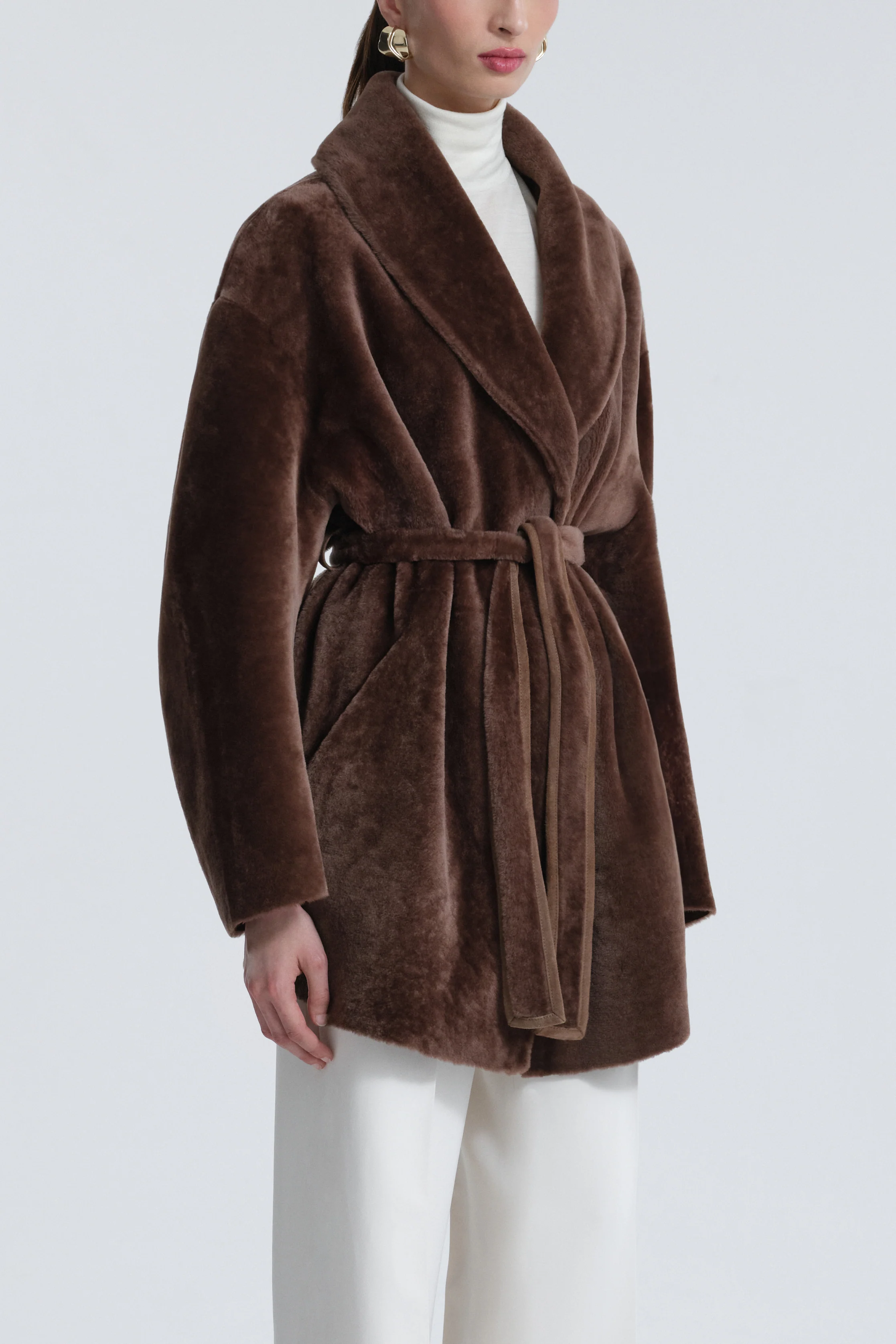 A coat in rich, plush shearling with a lightweight feel. Defined by a belted silhouette that wraps with ease and warmth. An enveloping layer of refined elegance.